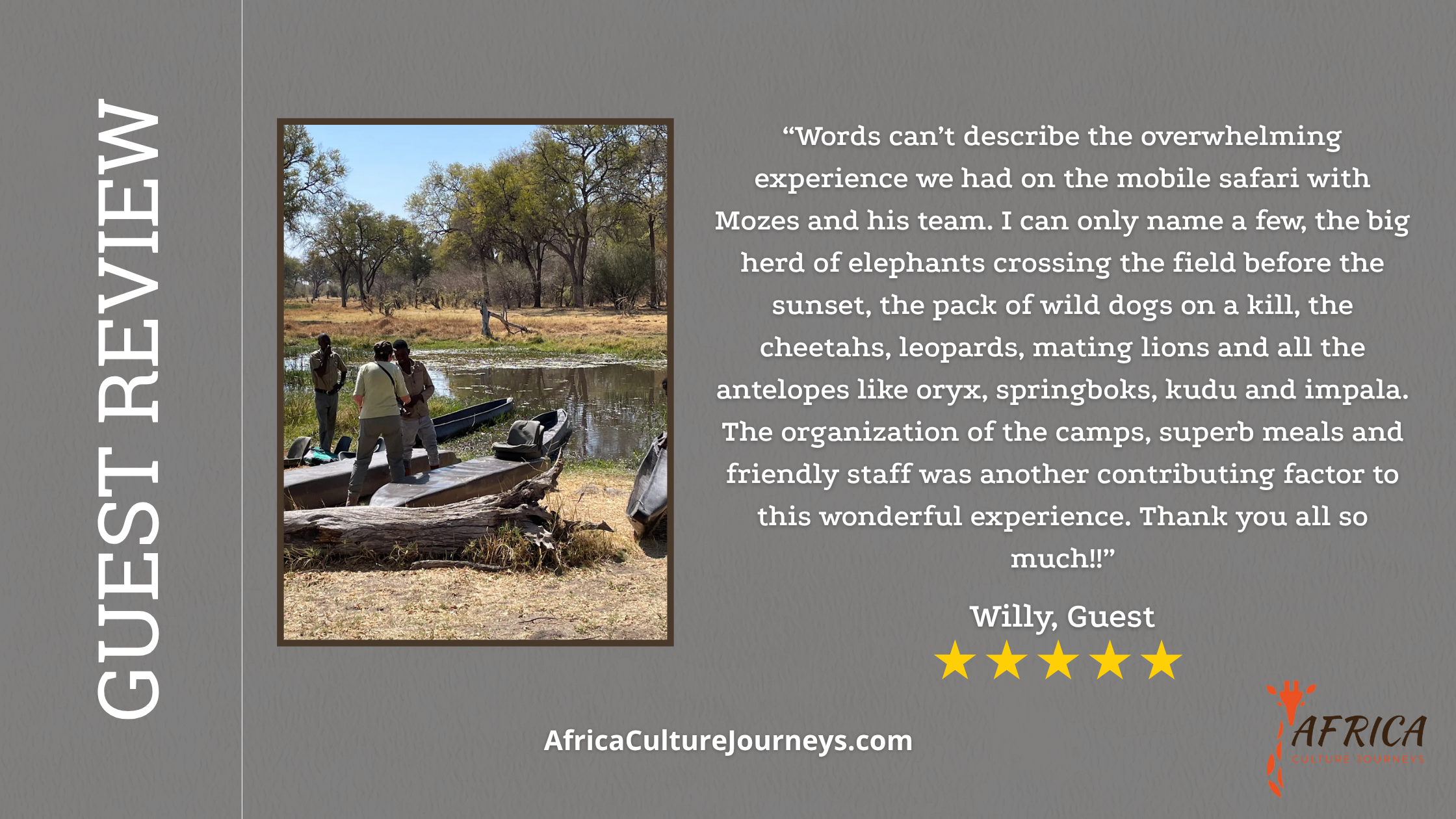 Africa Culture Journeys offers camping safaris celebrating Botswana’s culture, showcasing the country’s heritage, wildlife, arts, traditions, and cuisine. We are mission-driven to provide once-in-a-lifetime journeys for our guests, which include unique cultural experiences, promoting sustainable tourism, and driving local economic support.